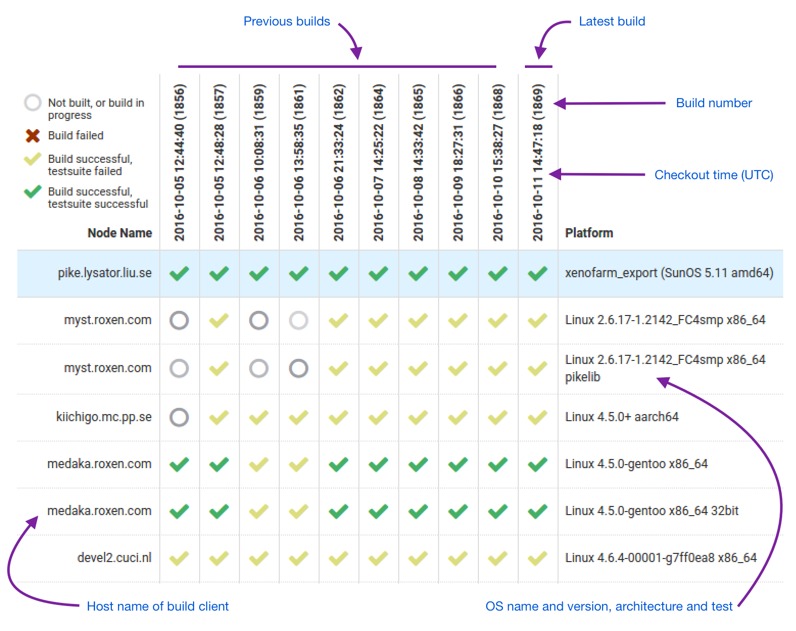 The rows of the table corresponds to different build machines, and the columns represents the results of different builds, the most recent one on the far right. For each build client (row), we see what operating system and hardware architeture it compiled for, and some also list a specific test profile used.